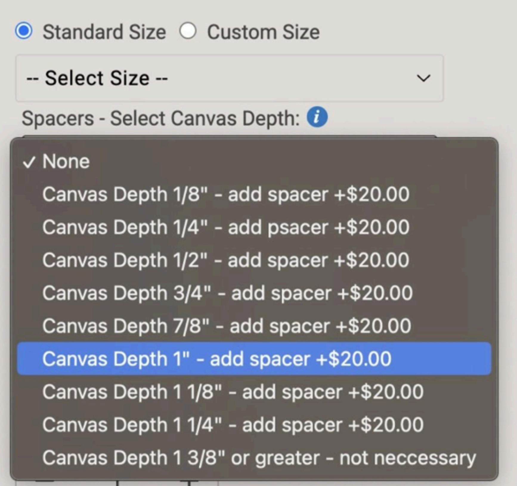 First, measure the depth of your canvas. Second, select “spacers” on the product page under “artwork dimensions” and enter the measured canvas depth.