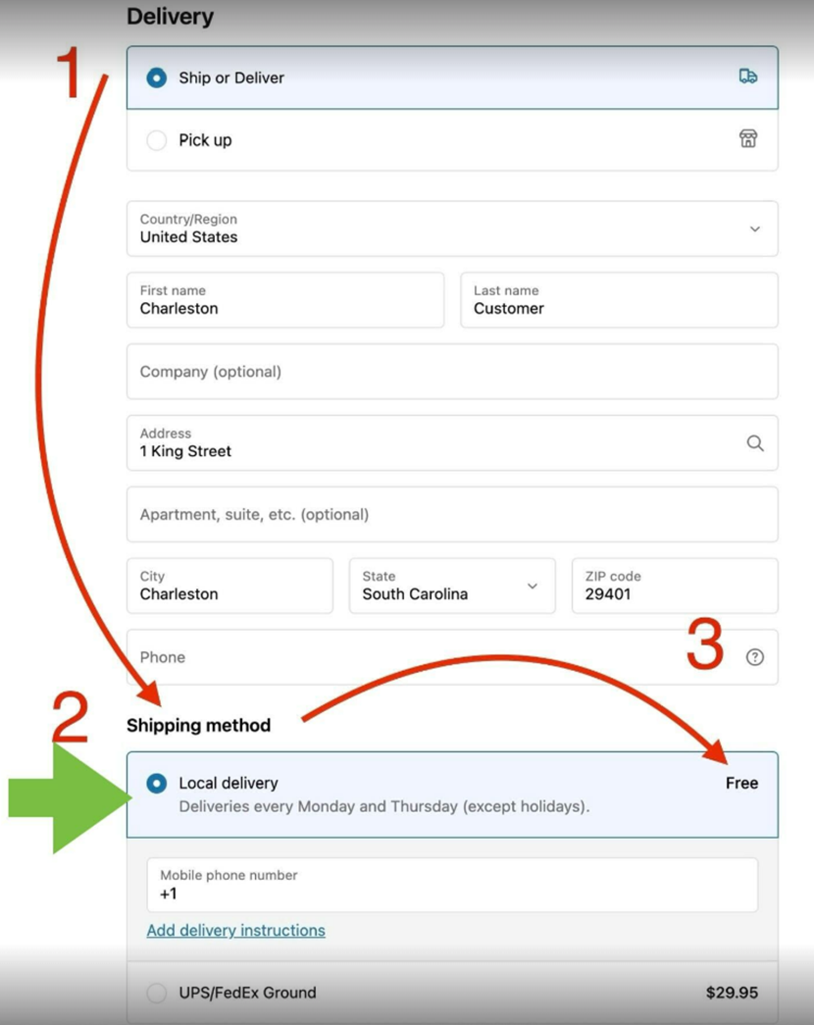 On the checkout page, be sure to scroll down below the shipping address field to “shipping method” and select the desired option. Make sure to select either local delivery or pick up to avoid a $30 shipping fee.
