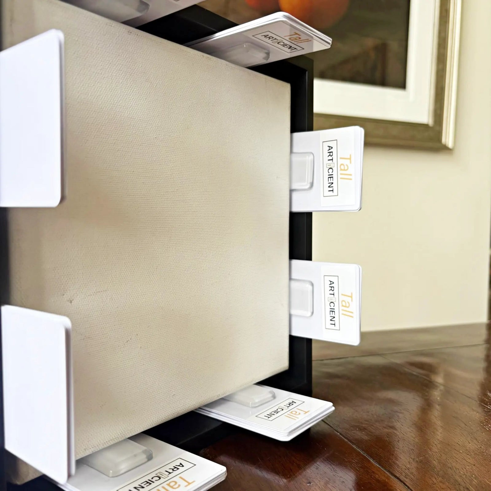 Product Description: Articient's patenting-pending Canvas Alignment Kit takes the stress and headache out of installing canvas art in a floater frame. With the Canvas Aligment Kit, centering and securing a canvas in a floater frame can be fast and relatively easy. Traditional methods (wood scraps, cardboard, business cards) lead to poor alignment and instability. The Canvas Alignment Kit is a tool-free, reusable system designed to make floater frame canvas installation quick, consistent, and secure.